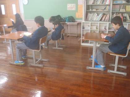 朝読書の時間,B教室では先生の「読み聞かせ」から内容を読み取るということをしています。A教室ではそれぞれが静かに読書に取り組んでいます。「ハリーポッターと賢者の石」なんていう大作を読んでいる人もいますよ。