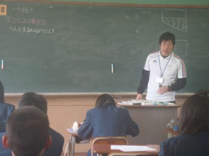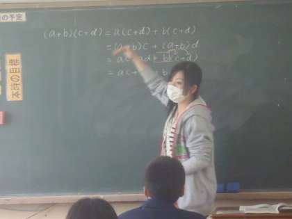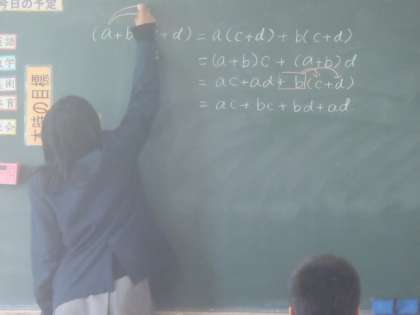 3年生は佐藤翼先生の社会と中玉利先生の数学の授業です。数学では生徒自らが分配法則を使って式の説明をしています。