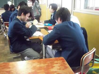 5組では班ごとに話し合いです。先生から「各班で2つ意見をまとめるように」と指示があり,「えーっ」と言いながら話し合ってます。