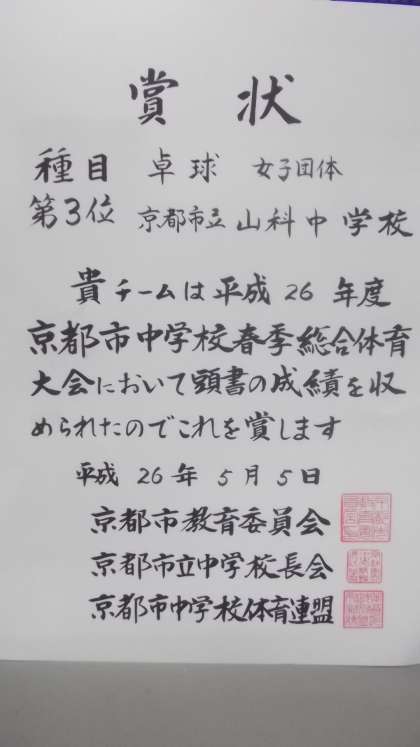 5月5日,西京極のハンナリーズ体育館で卓球の男女団体戦が行われ,男子はベスト8で惜しくも敗れましたが,女子は準決勝に進出し,第3位となりました。おめでとう。生徒たちの活躍の様子は後日掲載しますが,まずは賞状です。