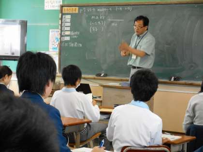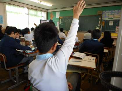 英語は3年5組で田中先生です。先生の問いかけに対して,積極的に手も上がっています。