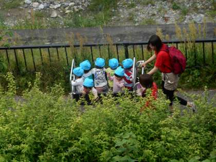 机の間を回っていると,ちょうど窓の下を保育園のトロッコが通っていて,子どもたちが楽しそうにはしゃいでいました。