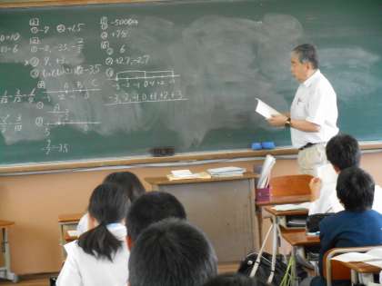 4組は数学のテストの返却。解答を解説しながら「この問題はできなくては困るよ」を何度もおっしゃってました。基礎基本の問題を多く出題されたのでしょう。黒板いっぱいに解説を書いてます。