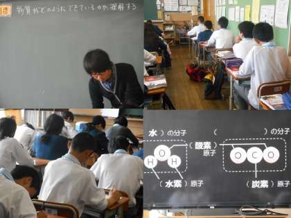 2年生の理科では物質について,水の分子や二酸化炭素の分子構造の説明です。国語は文法の練習問題の様子です
