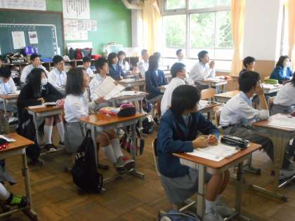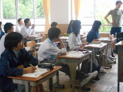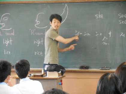 にぎやかな声が聞こえる,元気あふれる授業です。「R」と「L」の発音の仕方の違いを説明されていました。