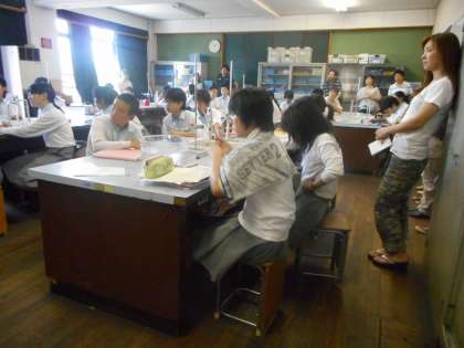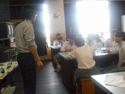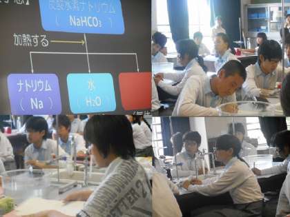 理科は水溶液の性質を確かめる実験の時間です。まずはパソコンからプロジェクターに映して,実験の手順を説明します。