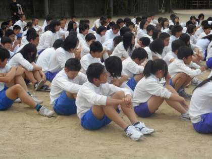 PTA新聞のための3年の教職員写真ですが,本番前にこんな一コマも。ノリのいい学年集団ですが,体育大会の学年練習ではびしっとやれます。