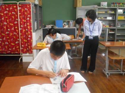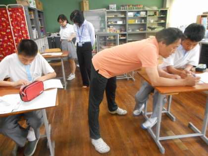 今日は教育委員会の先生もお見えになりました。1・2年の各クラスを見てもらい,最後に8組を見ていただきました。今日の数学は3年生が体育大会の学年練習なので,A・B合同での授業ですが,「しっかり計算に取り組んで頑張っていますね」と言っていただきました。