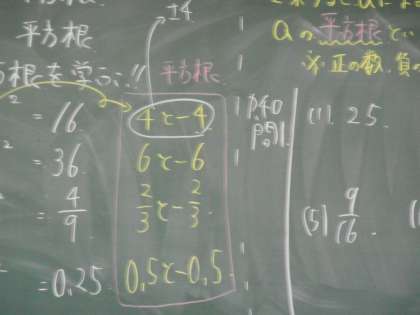 今日の目標は「平方根を求める」で,整数や分数,少数の平方根を求めています。