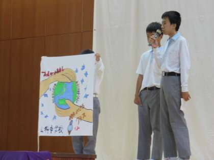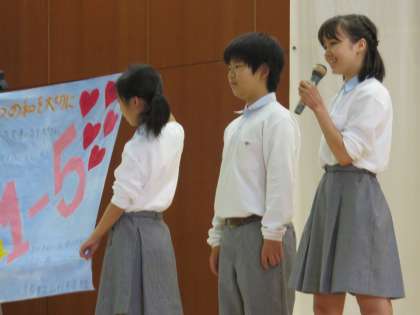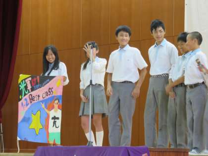 各学級からのアピールです。最初は1年生と8組です。学級担任や学級の目標,学級旗の由来などについて話してくれます。聞いていると担任の先生と苦労しながら作り上げていったんだなと感じます。
