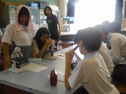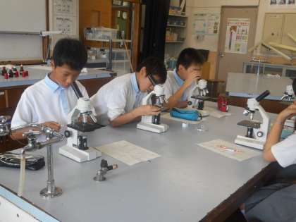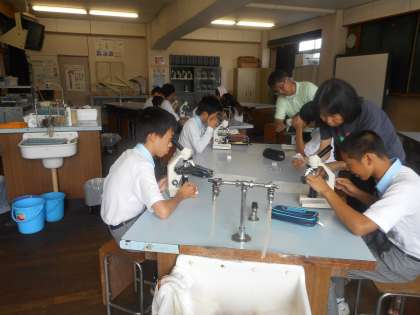 今日は「いろいろな細胞を観察してみよう」という実習です。顕微鏡でうまく焦点を合わせるのが結構難しそうです。それでも「あっ,見えた!」「僕の細かくて小っちゃい」など,だんだん上手に見えるようになっていきました。