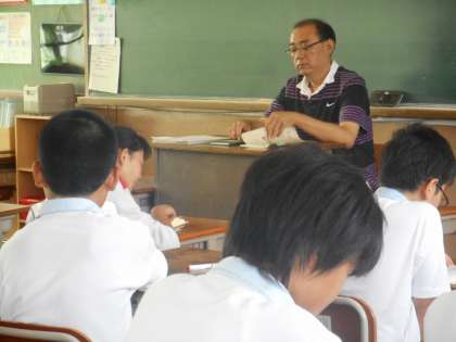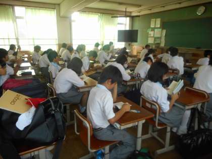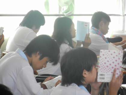 今朝は副担任の宮國先生が読書の指導です。5号館は朝日がまともにあたるので,エアコンをつけてもしばらくは暑い状態です。