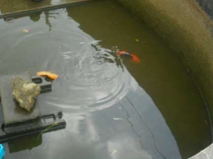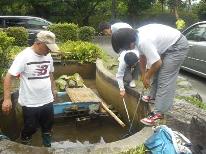 魚の姿が見えないくらい濁っていたため,管理用務員さんが池の掃除をしてくださいました。ポンプで水を抜きながら,鯉やフナ,オイカワ,ドジョウ,メダカを水槽に移します。そのあと泥をすくって池をきれいにしました。ちょうど放課後で,部活動前の英語部の生徒たちが手伝ってくれました。