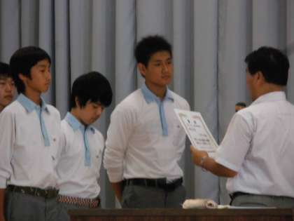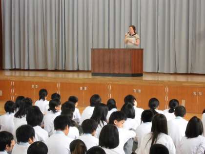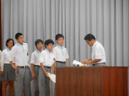 美化コンクール,ベル着点検の表彰の後,学校長の話。最後に2年間お世話になったALTのダナイさんのお別れの言葉です。中学生にも分かり易い英語で挨拶をしていただきました。
