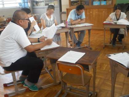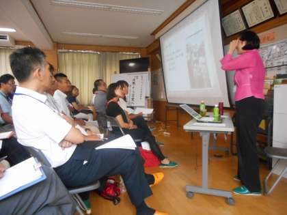 8月20日,山階南小学校を会場にお借りして,山科中学校・百々小学校と3校での合同研修が今年も行われました。全体会では,山階南小学校西田校長先生の挨拶と方向付けがあり,最初に元皆山中学校PTA会長でNPO法人「万華鏡コミュニケート」代表の藤尾まさよ氏より,「沈黙から目覚めへ」というテーマで講演をしていただきました。