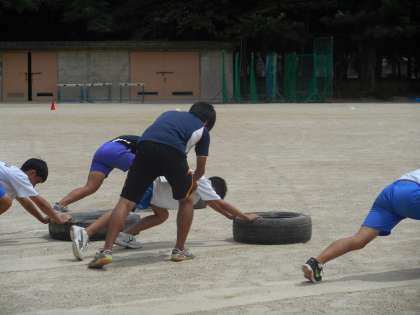 午前中のグラウンドでは,深見先生の指導の下,駅伝競走部と男子バスケット部が合同練習を行っています。