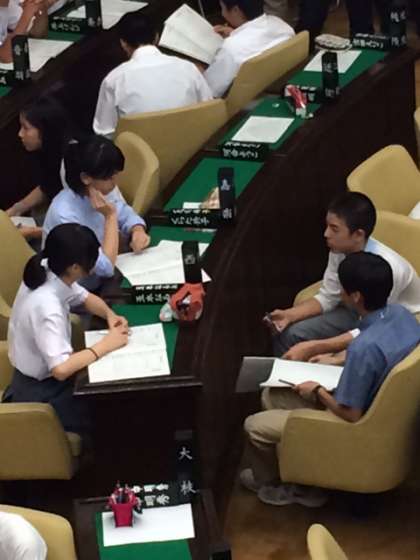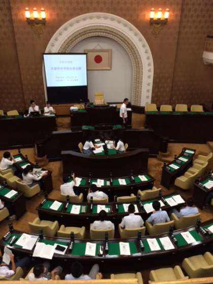京都市長並びに京都市議会のご好意で,今回初めて本物の市会の議場を使わせていただき,全市の中学校から集まった生徒会の代表たちも,やや緊張した面持ちです。