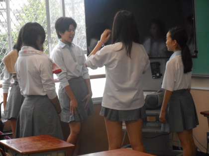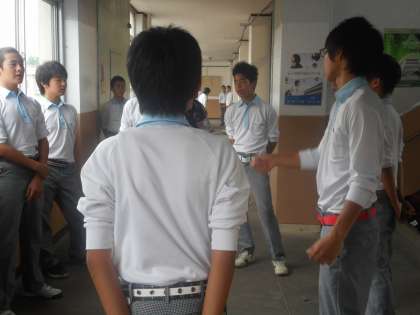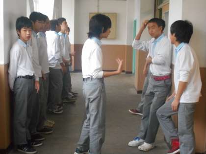 隣りのクラスと廊下や階段で背中を合わせながら歌っています。まずは隣がライバルでしょうか?