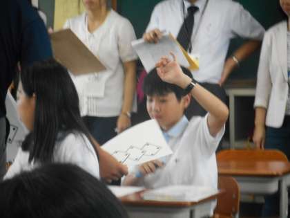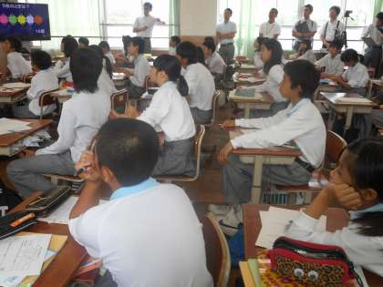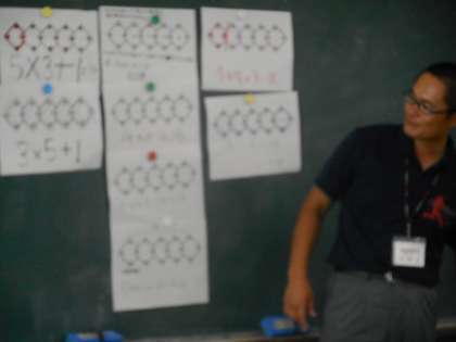 正方形の紙を黒板に止めていくのにいくつ磁石がいるか?1枚なら4個,2枚なら7個(1つは共用で使える),3枚なら・・・5枚なら・・・と,考えていきます。