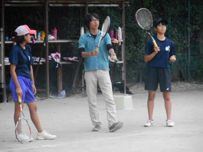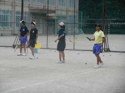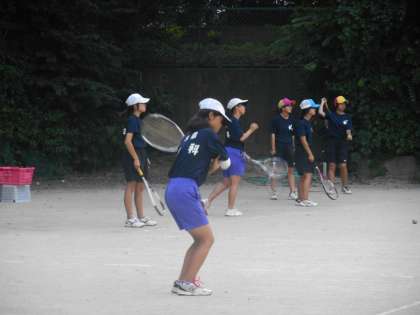 ソフトテニス部は14日(日)に団体予選があるので,活動時間を延長して頑張っています。2年生が中心ですが,それでも30人近くの人数です!