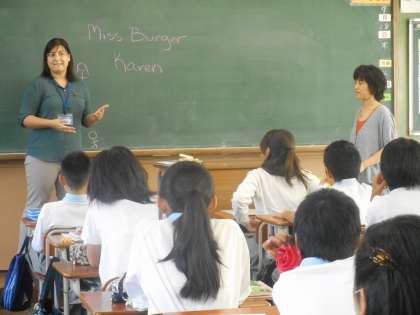 5組では英語の研究授業です。今日はALTのバーガー先生もお見えです。自己紹介から,先生の家族や住んでいるところ,好きな野球チームやスポーツ,買っているペットなどを聞き取ってこたえていきます。