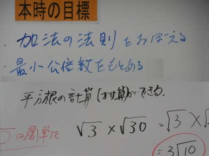 今日の目標は,数学はA組が加法の法則と最小公倍数,B組が平方根の計算(かけ算)です。