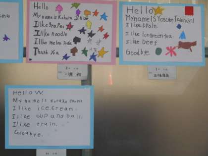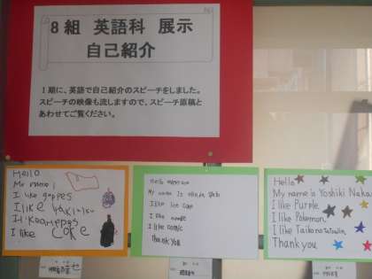 8組の作品も同じく自己紹介です。「My name is 〜」。がんばって作りました。教室でのスピーチの様子は,映像で流されて,みんな上手に話しています。