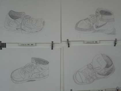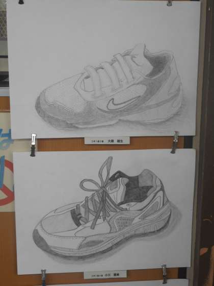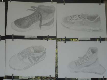 2年生はスニーカーのスケッチです。今にも歩き出しそうな靴,一日歩き疲れたような靴,いろいろ表現してくれています。