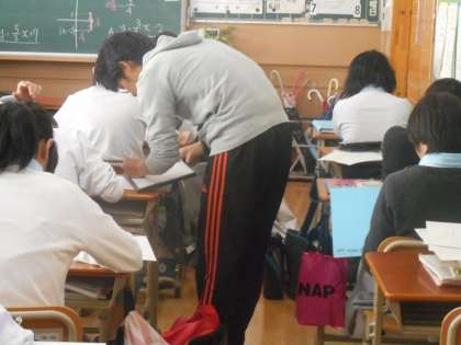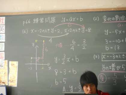 2年生の数学,テスト対策の問題を解いています。教育実習にきていた上野山先生が,今週から学生ボランティアとして週に2回,また,土曜学習にもきてくれます。