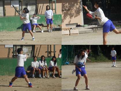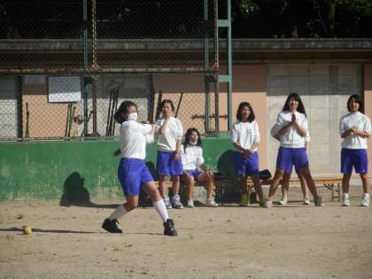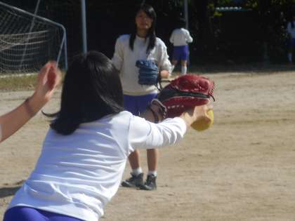 女子の体育はソフトボールです。授業も進んできて頃のアウトを取ったり,だんだん「らしく」なってきました。