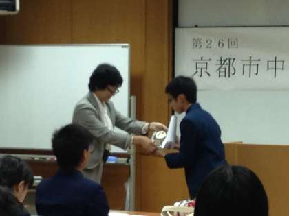 先日の中学校総合文化祭朗読コンクールでの表彰の写真です。国語研究会会長の武田校長先生から,3年の今北君が表彰状や盾を頂きました。新しい図書委員会でも,是非チャレンジしてください!