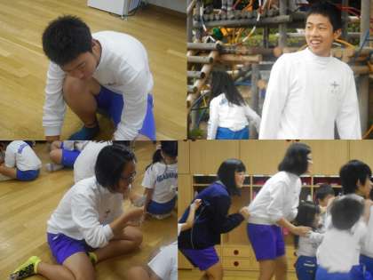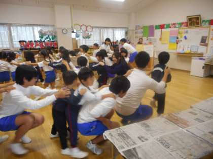 教室で自分たちが作った絵本を読み,簡単なジャンケンゲームをして,その後は外遊びです。一緒に遊ぶ中学生がバテるくらい,子どもたちはよく動き,よく走ります。