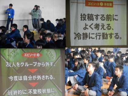 続いて友達間での「ライン外し」で学校に行けなくなってしまった事例。最後はフェイスブックなどに自分のプライバシーを気軽な気持ちで登校したり,SNSで知り合った相手に軽い気持ちで会ったりすると,自宅を突き止められ,ストーカーなどの被害に遭ったり,大きな事件に巻き込まれたりという事案についてもお話し頂きました。
