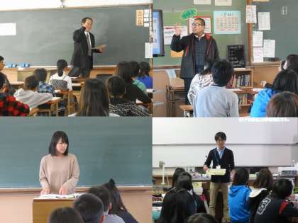 1.生徒会から歓迎の挨拶。2.左上から時計回りに英語・社会・理科・国語の授業。3.育成学級の美術のようすです。