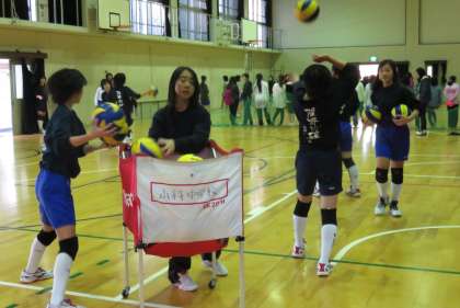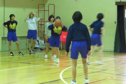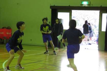 女子バレー部と女子バスケット部の活動のようす。いつもより狭い場所で工夫して練習しています。