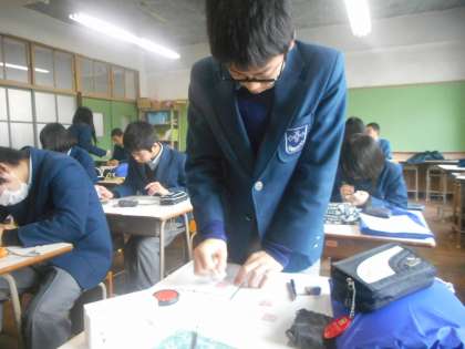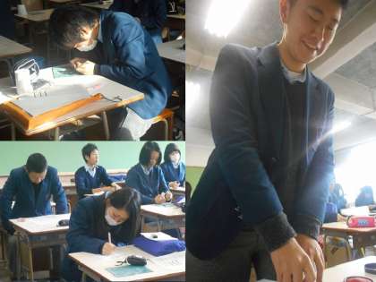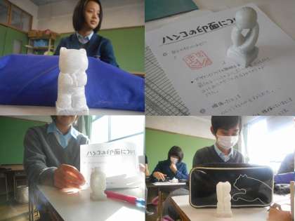 完成した人が,作った篆刻と一緒にポーズを取ってくれました。3年生は授業も残りわずか。これが終わると,いよいよ最後の作品になるようです。