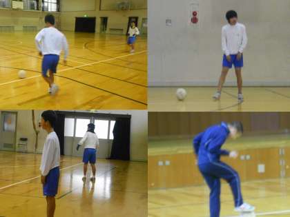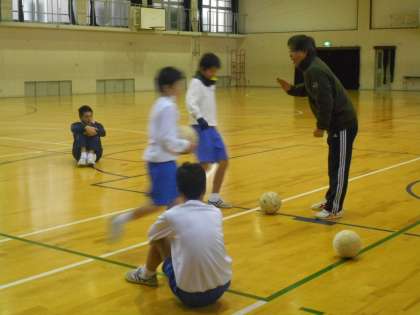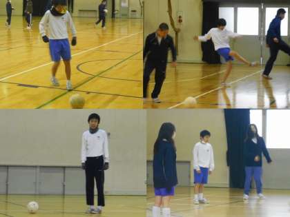 体育館でサッカーの授業が始まりました。今日は最初にキックの練習です。矢野先生の指示で,サイドキックやインステップキックを練習しています。
