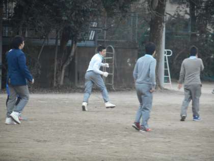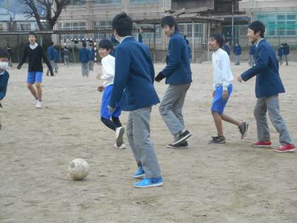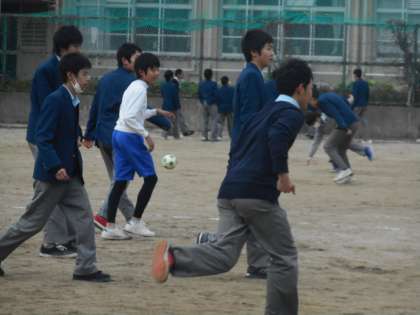 3年生の男子,3つぐらいの大グループに分かれてサッカーを楽しんでます。サッカー部の生徒やクラブチームで活躍していた生徒もたくさん参加しています。