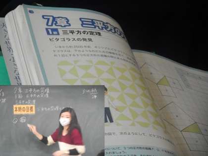 3年生は「三平方の定理」についての学習が始まりました。2500以上も前に,ピタゴラスという人が導き出した公式。中学生がどう挑むのか楽しみです。
