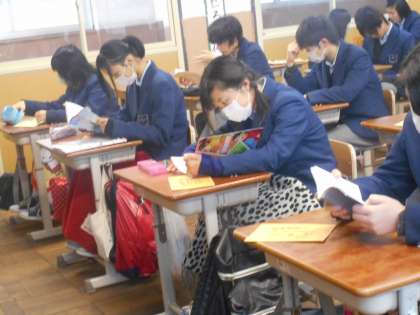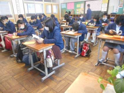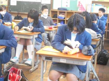 3組は静かに読書に取りかかっていて,朝から穏やかな時間が流れると同時に,集中力を感じます。中玉利先生も供託のところで本を読まれています。