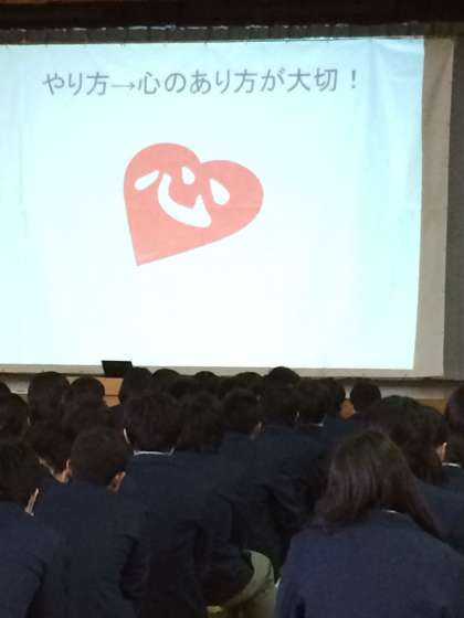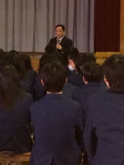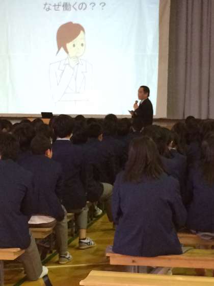 2年生は今月の27日から始まる生き方探究チャレンジ体験に向けて,体育館で働くこと,学ぶことについてお話を聞きました。