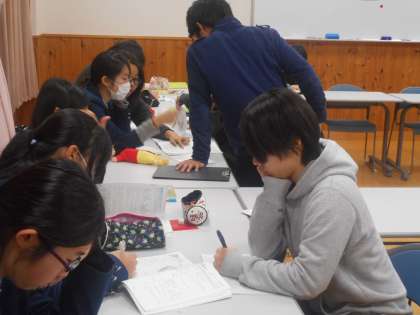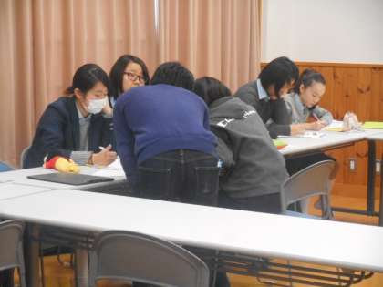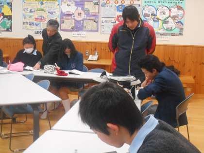 今日も3年生が熱心に勉強しています。3年の校舎が電気工事のため,今日はふれあいルームで学習です。生徒は十数人で,5人の学生ボランティアさんと3人の先生で教えてますが,質問も多くフル回転です。