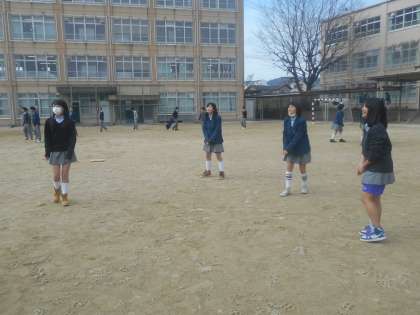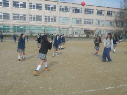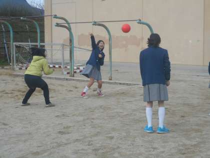 大寒で曇っているとはいえ,比較的暖かいお昼休み。1年生の女子は先生と一緒にバレーボール。