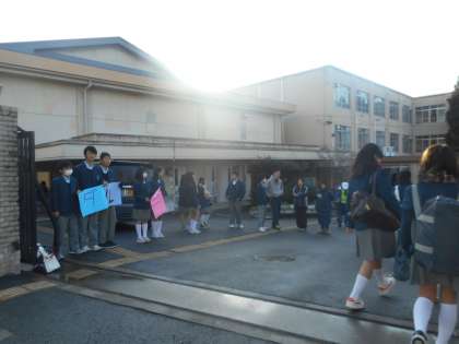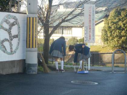 ダルニーの呼びかけの横では,いつもと変わらず駅伝競走部が校門付近を掃除してくれ,女子バレー部が校門の中を掃いてくれていました。