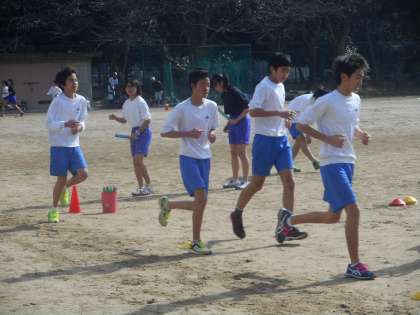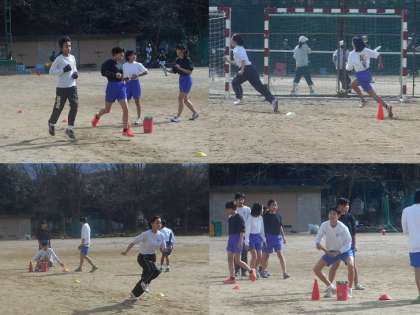 朝からグラウンドが全面使えるので,トラックを作って中長距離はランニングや短距離はリレー形式で走っています。