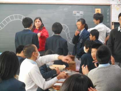 今日の英語はALTのバーガーさんです。グループに分かれ,クイズに答えて双六のようなコースを進んでいきます。