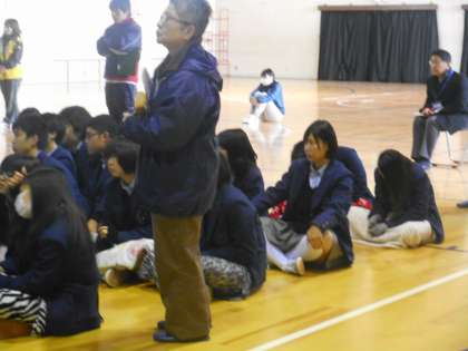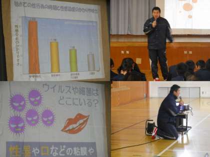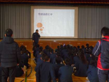 1時間目,体育館に2年生を集めて,体育の東田先生による性教育が行われました。性感染症やエイズについて学んでいます。教育委員会からも保健体育科の上田指導主事が参観に来られました。