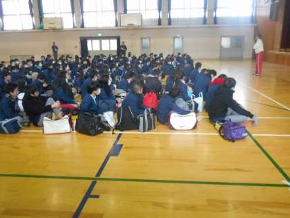 最初に学年主任の島井先生から注意があり,続いて校長先生から激励の言葉です。話の最後に「ここにいる3年生の先生たちは,自分のためでなく,みんなに頑張ってもらいたいから,応援してくれています。人は,『よし、この人のために頑張ろう!』と思えた時が一番チカラを発揮できるものです。だから 毎日の食事の準備や送り迎えをしてくれた保護者の方,悩みを聞いてくれたり,アドバイスをくれた友達や学校の先生,塾の先生・・・。今までアナタを支えてくれた人たちの事を思えば,最後までやり切れるはずです。週明けの入学試験,しっかり頑張ってください。みんなの幸運を祈ります。」とありました。