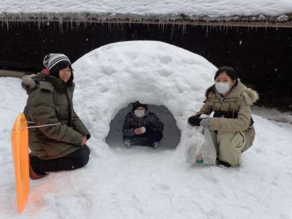 雪滑りをしながら,「かまくら」にも入ってみました。あっという間に時間が過ぎた,楽しい二日間だったようです。