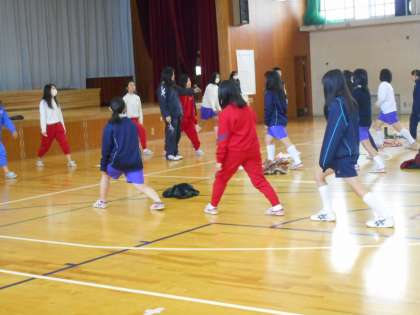 最後の球技大会,女子は体育館でドッヂボールのスタートです。ポーズも決めて元気よく始まります。